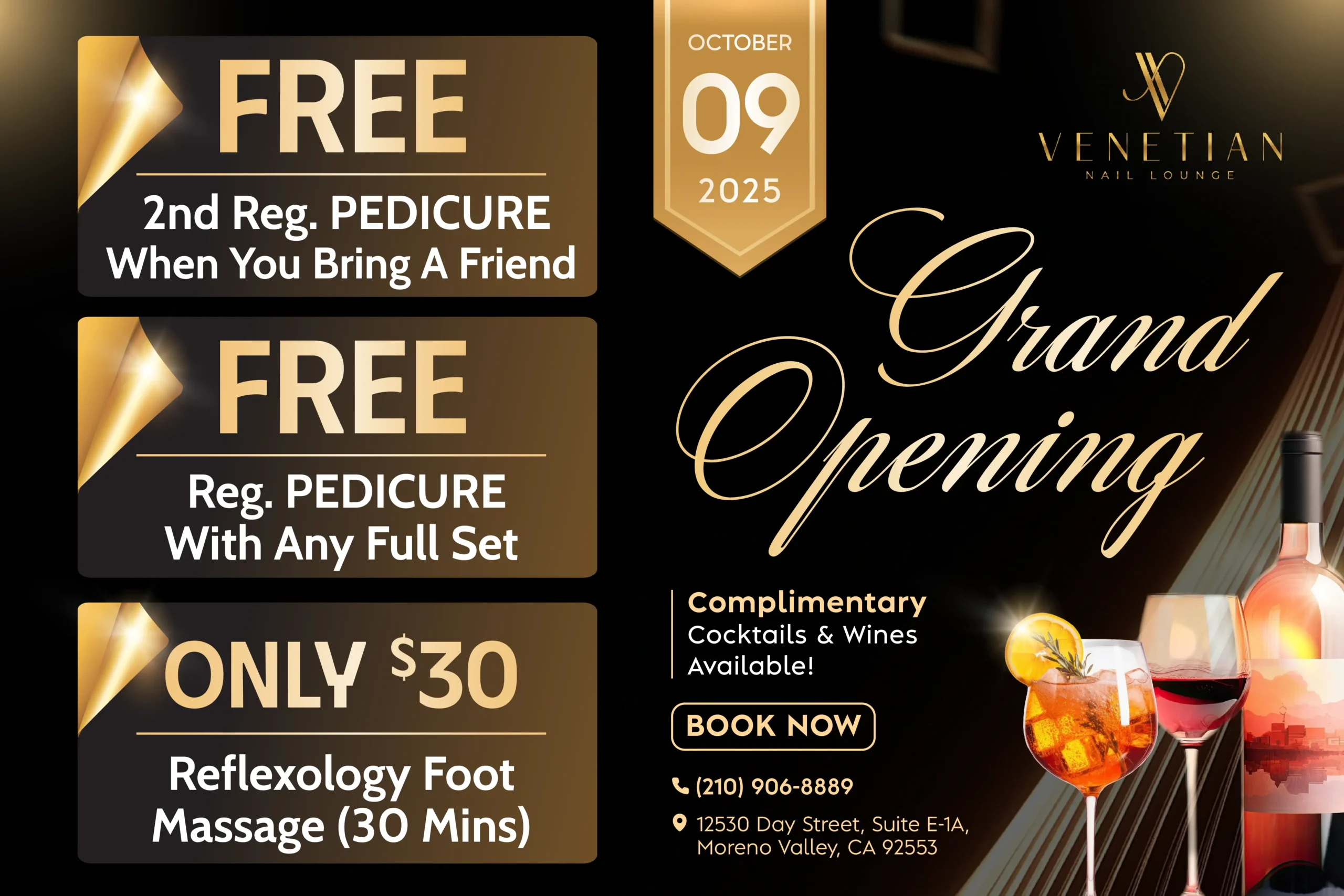 At Venetian Nail Lounge, we don’t just polish nails—we elevate the entire self-care experience. Located at 12530 Day Street, Suite E-1A in the heart of Moreno Valley, our lounge was built with one goal in mind: to create a sanctuary where beauty, comfort, and artistry meet. Every corner of our space is designed to help you unwind, refresh, and leave feeling even more confident than when you walked in.